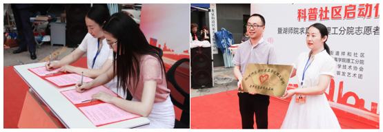 仪式中,团总支书记刘晔代表理工分院与祥和社区签署共建科普志愿者服务基地协议,理工分院党总支副书记周渠梁向祥和社区授牌并致词。随后,理工分院青年志愿者服务分站站长程哲带领志愿者进行宣誓。